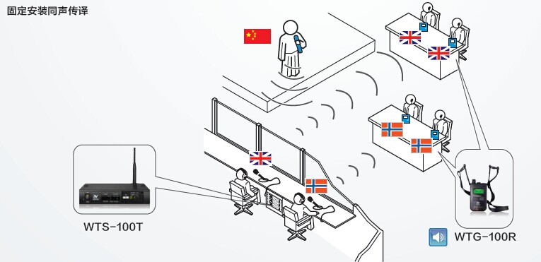 国际会议上使用的传译机器复杂不易管理。WTG 100 不仅 使用灵活,而且很方便管理,非常适合用于国际会议同声传译。它由16个通道组成,在会议场可同时进行多达16个语言的同声传译。WTG100可保证各种国际会议、教会及宗教团体盛会的成功传译。